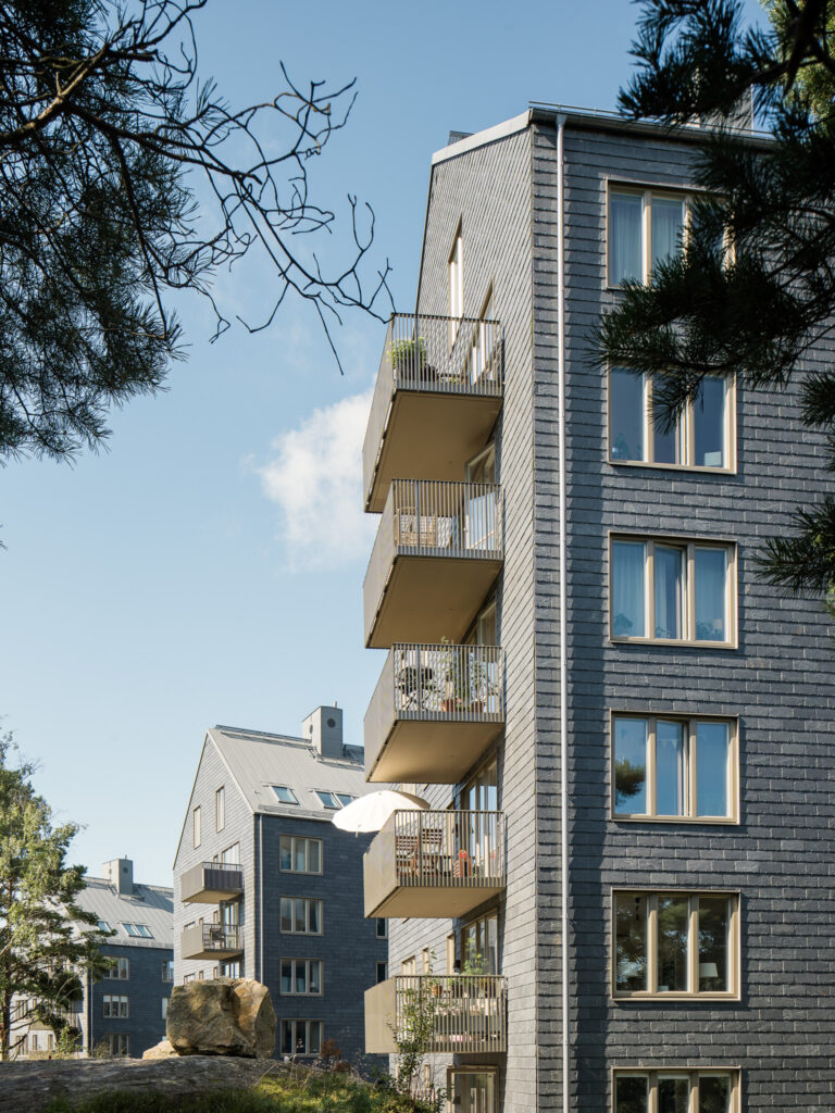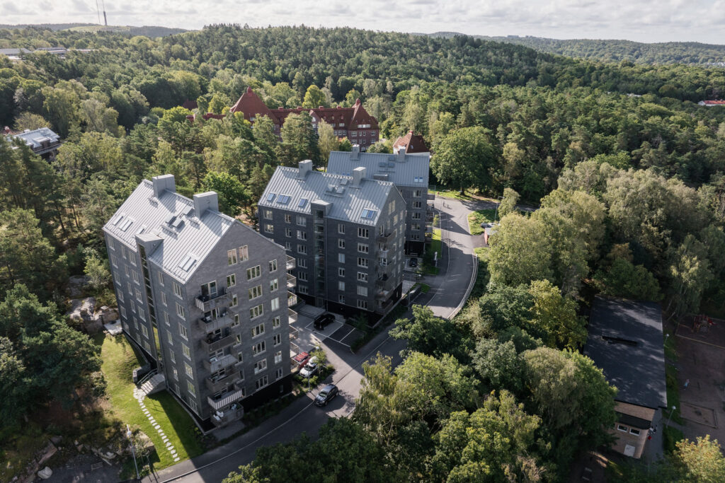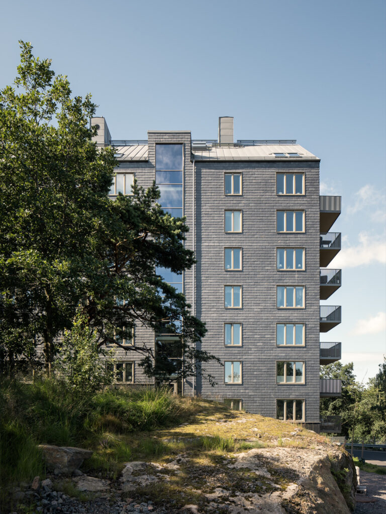 Högt uppe på Kålltorp så blickar tre nya bostadshus ut över Göteborg.Byggnaderna, som har haft högt ställda krav på utformning och lägenhetskvalitéer, står som inkilade i landskapets klippiga backe med nedersta våningarna i suterräng. Projektet har tagit inspiration från både berget, tallarna, Renströmska parken, och vyerna från platsen. De vackra fasaderna i skiffer och trä anspelar på material från platsen, samtidigt som tydliga och rena husvolymer definierar landskapet med sina placeringar längs med den böjda bergsvägen upp till Kålltorps topp.