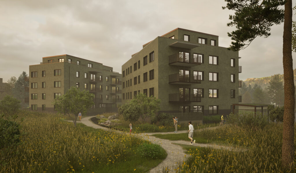 Tillsammans med OBOS och Veidekke ritar vi på åtta flerbostadshus, med tonvikt på naturmaterial. Sockelvåningar i grå skiffer tar upp landskapets varierande lutningar för att sedan gå över i en liggande träpanel som målas i olika kulörer. De två första husen är i fem våningar med två olika gröna nyanser.